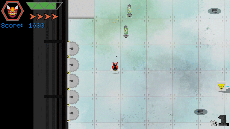 An arcade styled game that features speedy, fast-paced action and is heavily inspired by the Mega Man series. While navigating the dangers of the arena, a player will encounter waves of enemies as they spawn into life. A successful player will eliminate each wave by dashing or pushing the enemy into the deadly rotating saw blades at the edge of the arena. The game ends once the player health points are depleted (similar to an arcade game like Galaga).